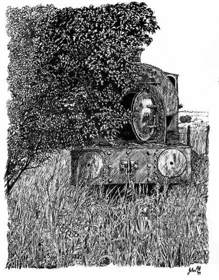 A mixture of computer and paper drawing of a photo of a dumped shunting engine. Mike’s engine before he and others rescued it.