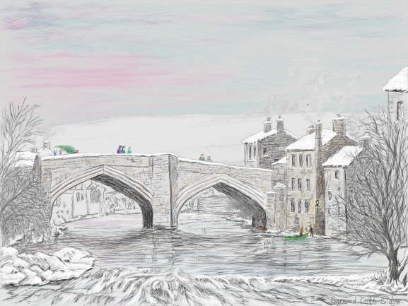 Copied from part a drawing by Edward Blore. He finished building Bukingham Palace for Queen Victoria after she had sacked poor Mr Nash. I have re-drawn it and added snow, figures and an evening sky. The children under the bridge started my mind feeling their plight and a poem and a drawing followed.